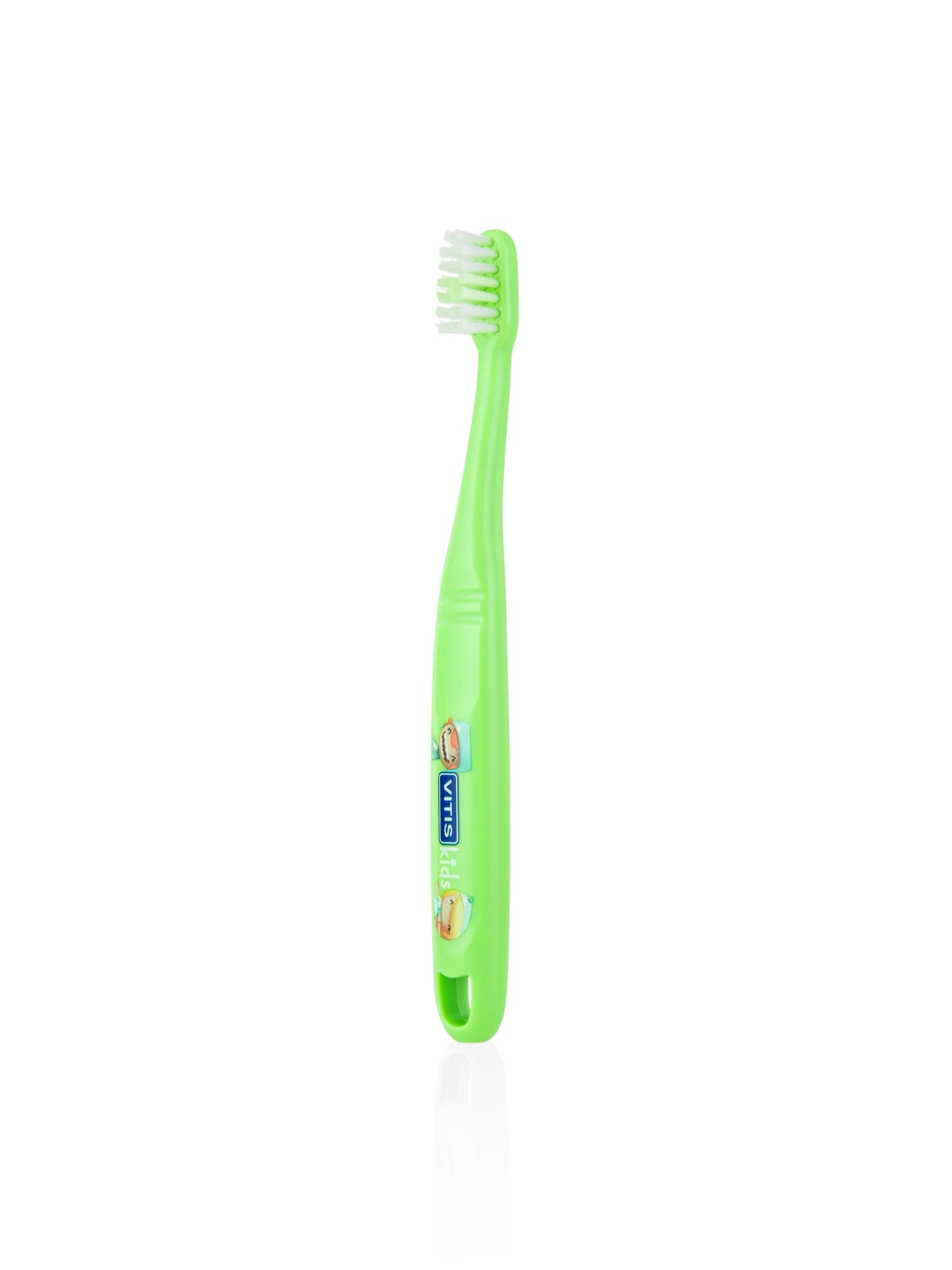 VITIS kids toothbrush is a daily use brush especially indicated for daily oral hygiene in children from 3 years. Its small, rounded end head allows better precision during brushing. Its filaments are soft and Tynex for effective hygiene protecting teeth and gums. It also has an applicable recommended quantity of toothpaste gel (pea size) with colored filaments.