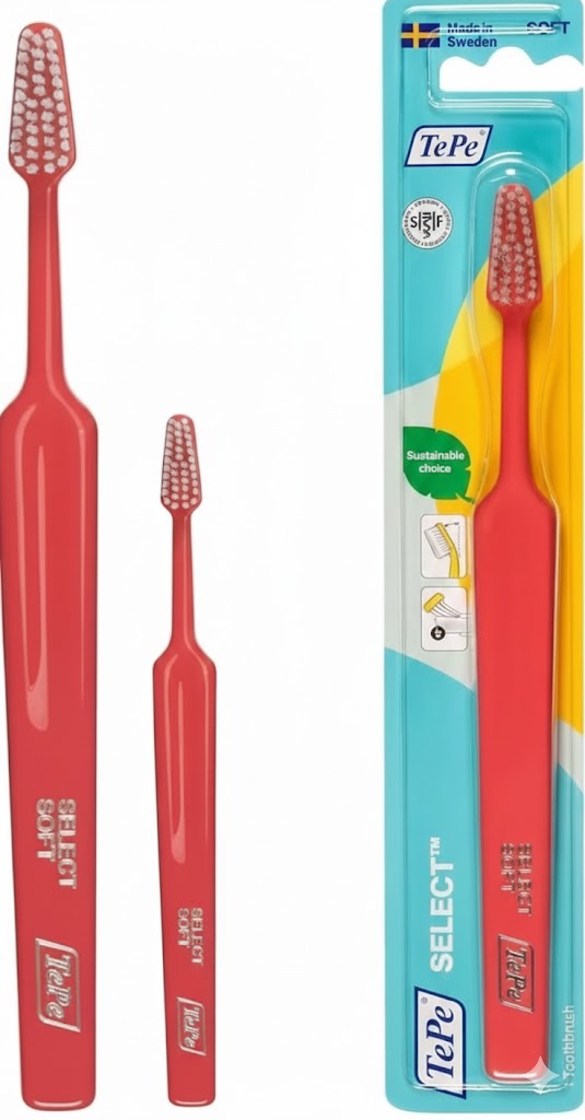 - The TePe Select toothbrush is a high-quality toothbrush with a user-friendly handle, a tapered brush head for improved access, and end-rounded bristles for gentle cleaning. It’s available in extrasoft, soft, or medium bristles.